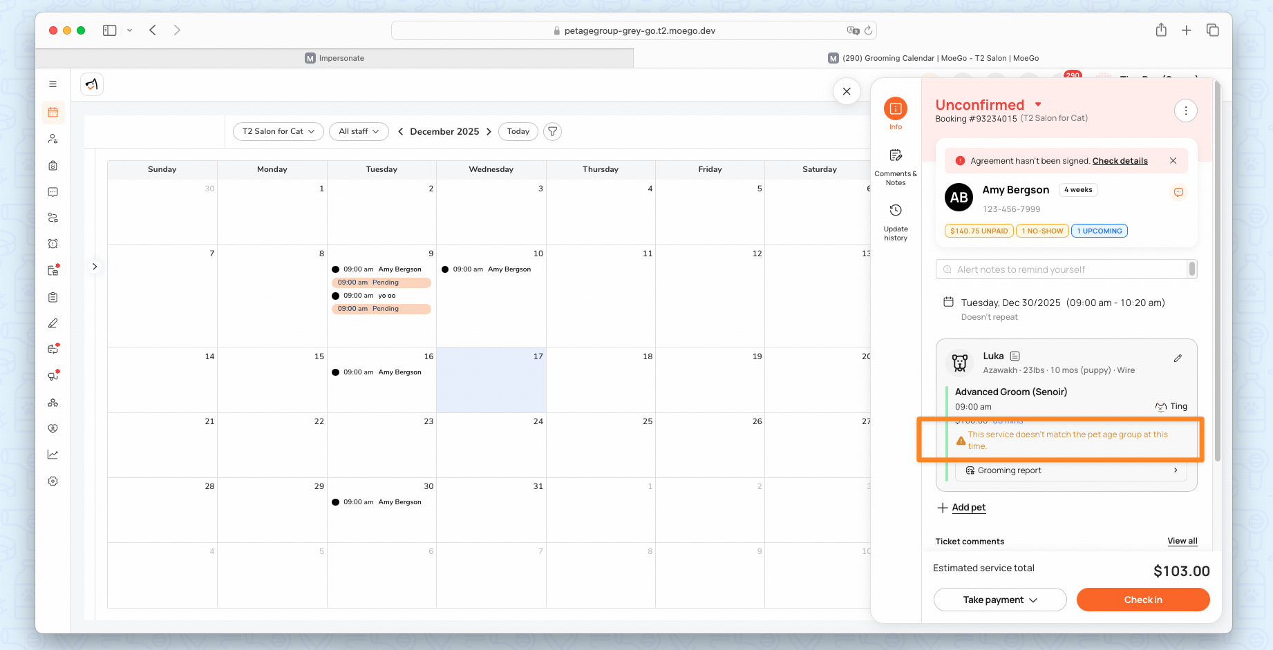 Mismatch reminders show up on appointment details when the services don't match the pet's age group.