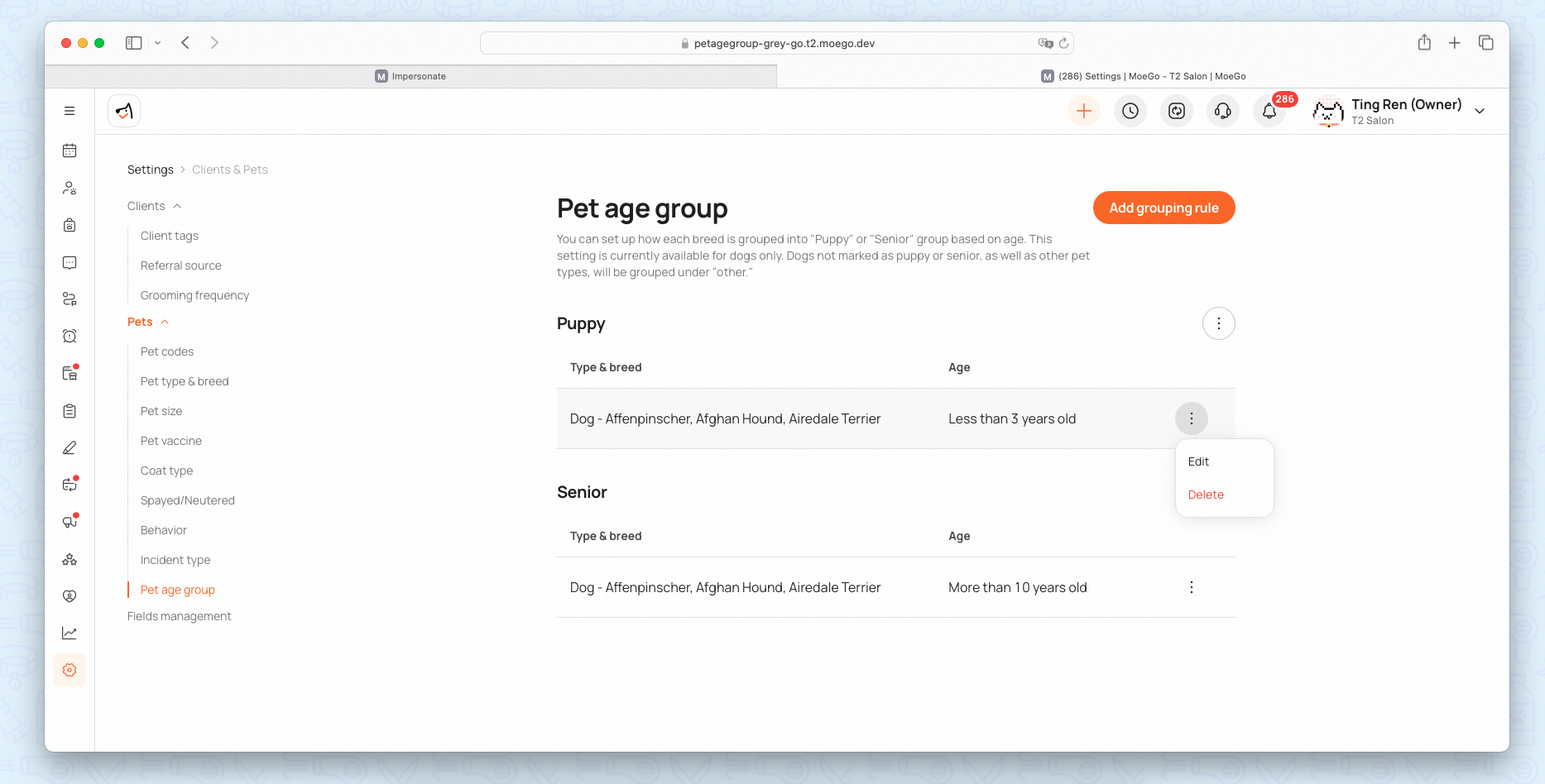 Can it be edited? | ❌ No — pet age groups are system-defined. | ✅ Yes — you can add, edit, delete, or reorder grouping rules. |