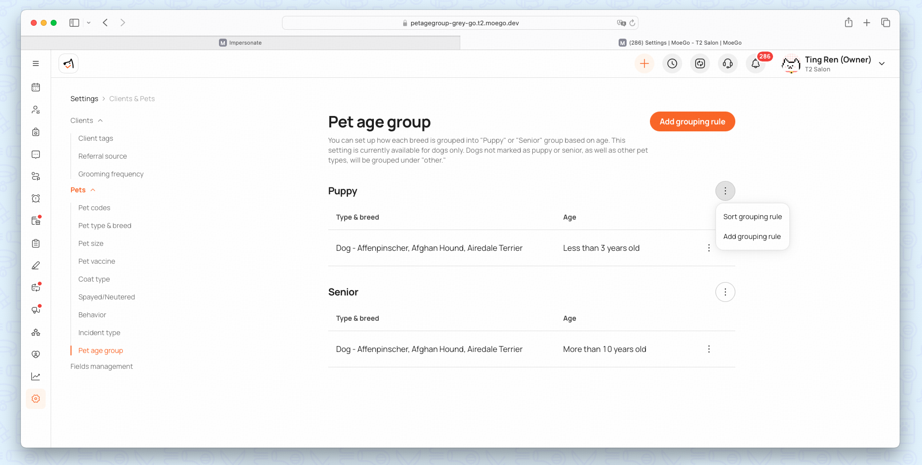 In short: Pet Age Group defines what label a pet receives, while Grouping Rules define how that label is assigned.