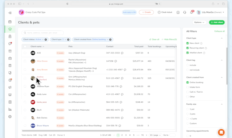 - Quickly segment the client list by detailed criteria, including appointment history, pet breed, grooming frequency, locations and other customized criteria.