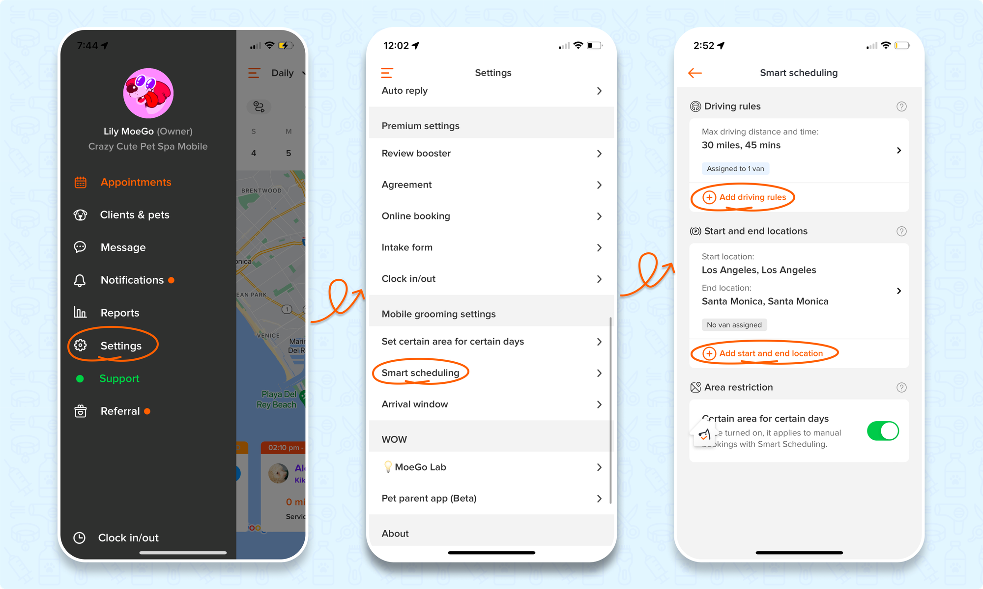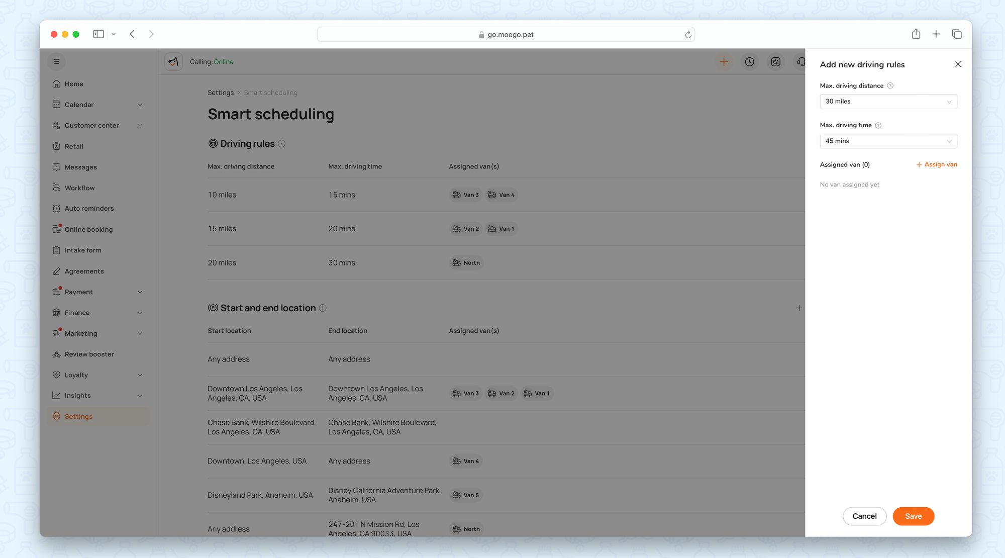 By turning on Smart Scheduling, your clients can only book slots if the maximum driving distance or time between the appointments before and after are within the driving rules and start and end locations set up.