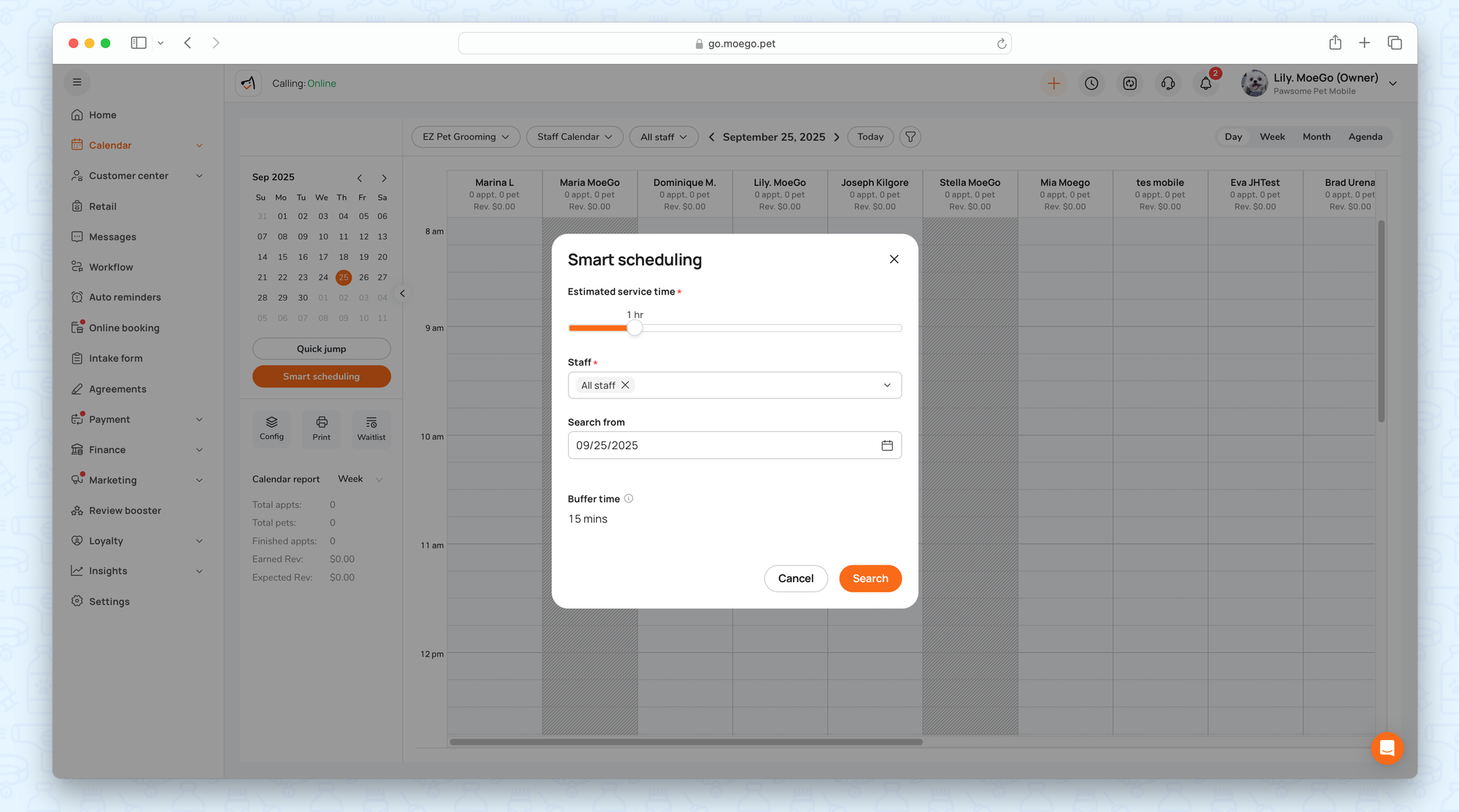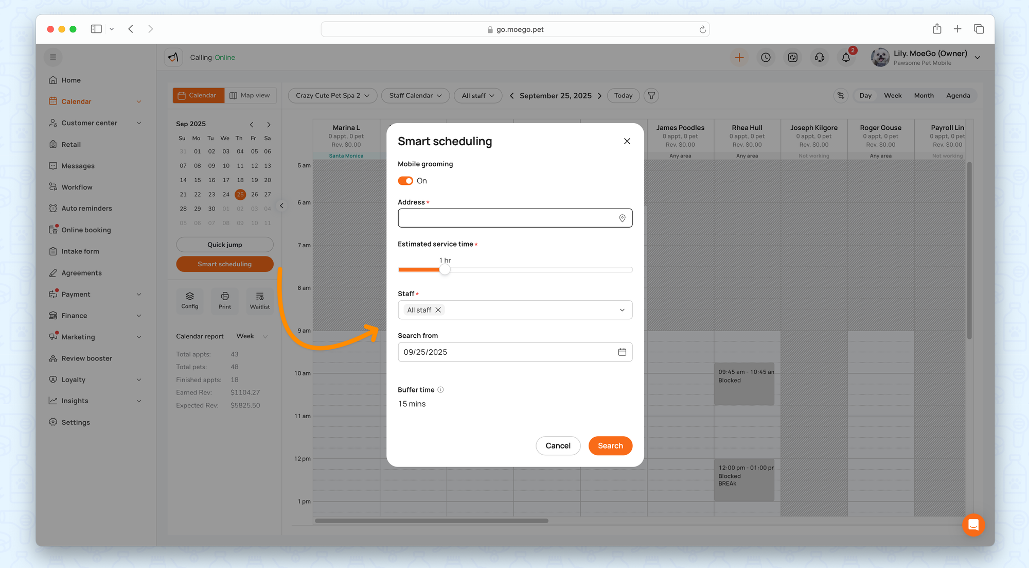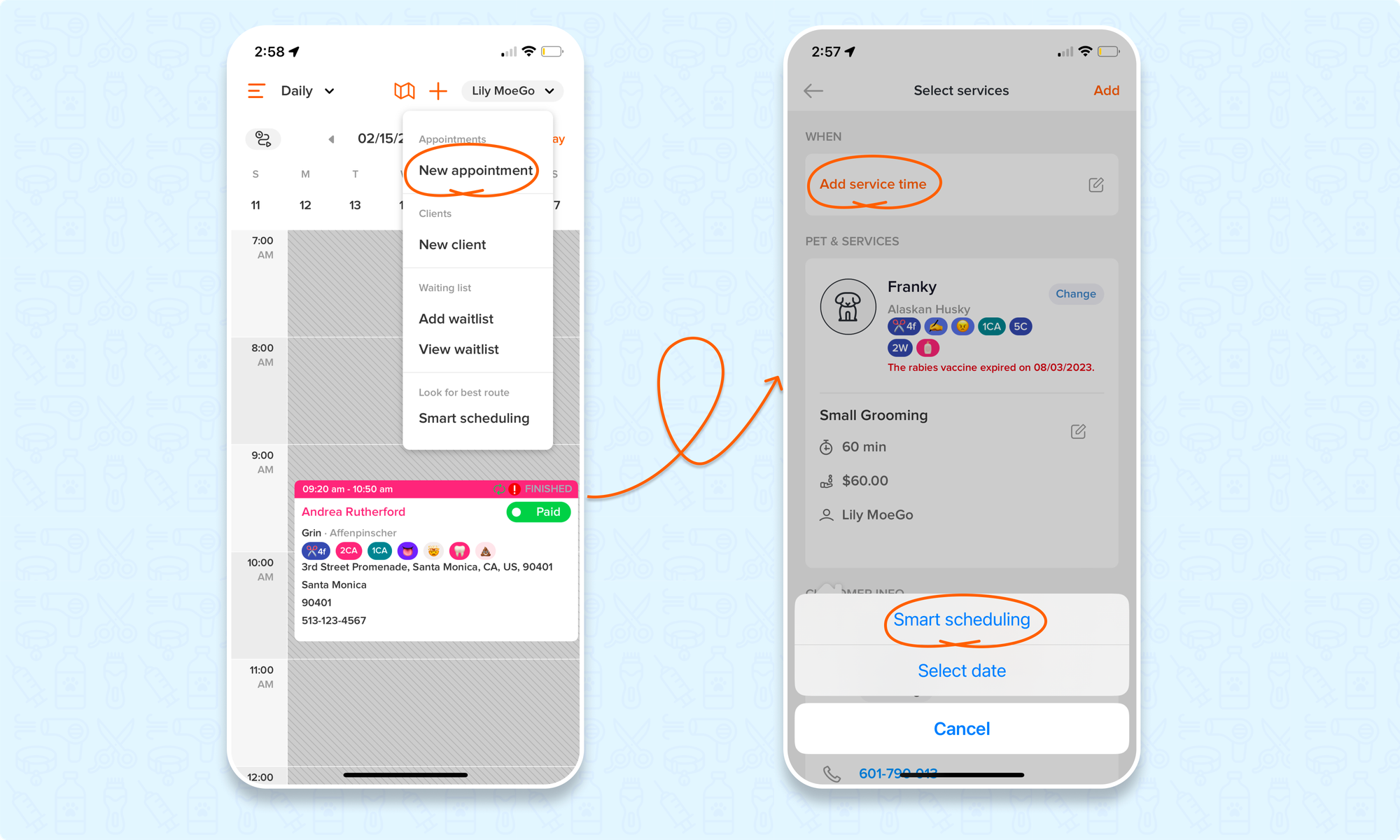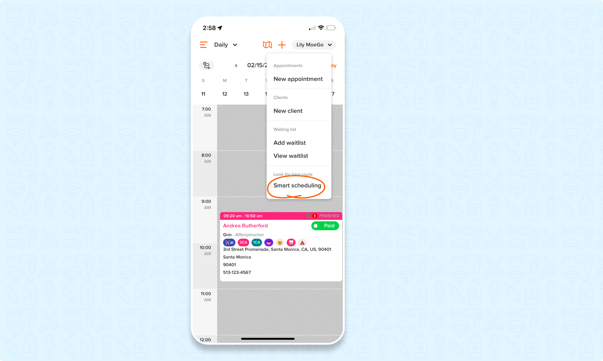To use smart scheduling when booking a mobile grooming appointment for an existing client on the app, you can: