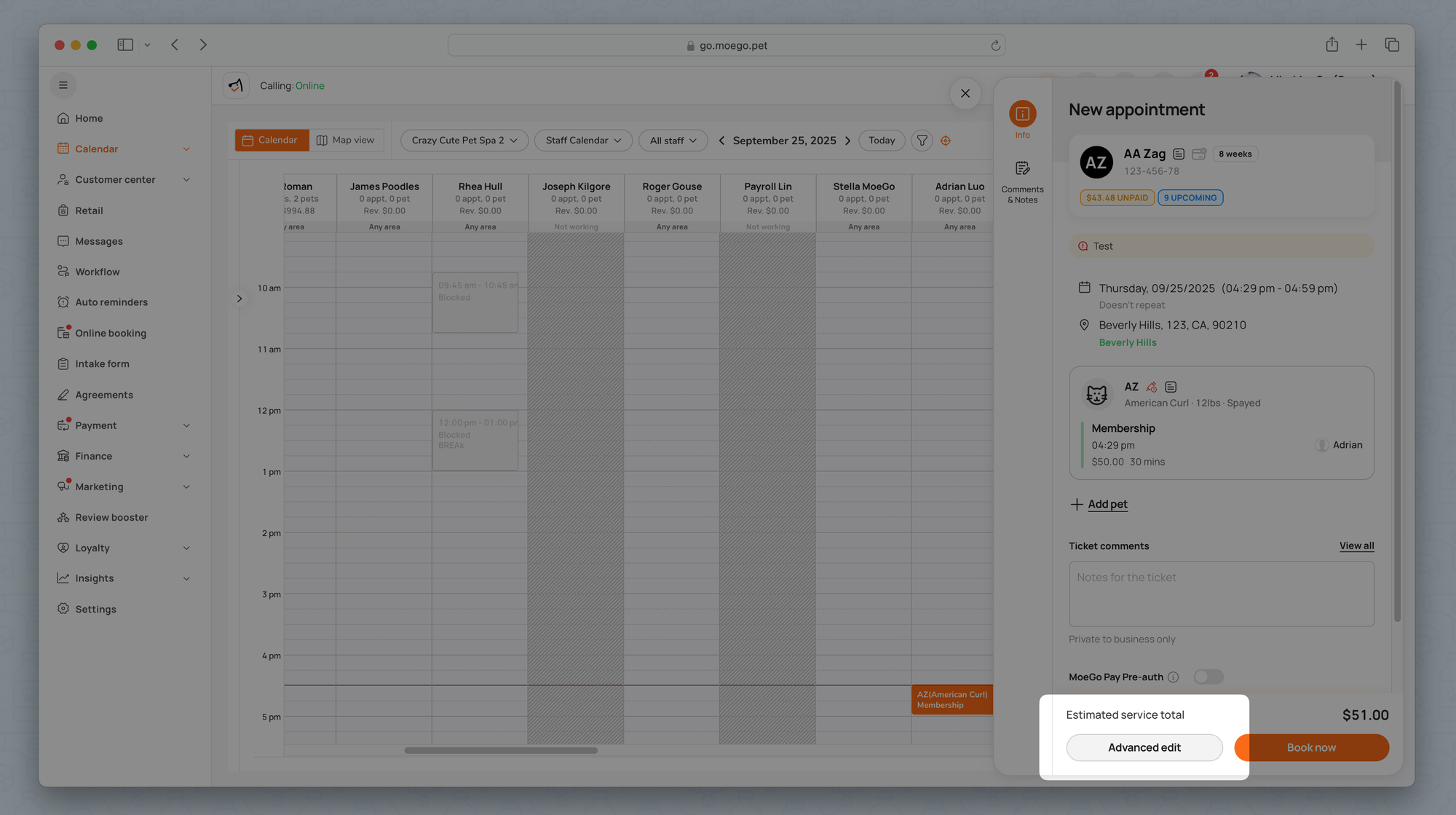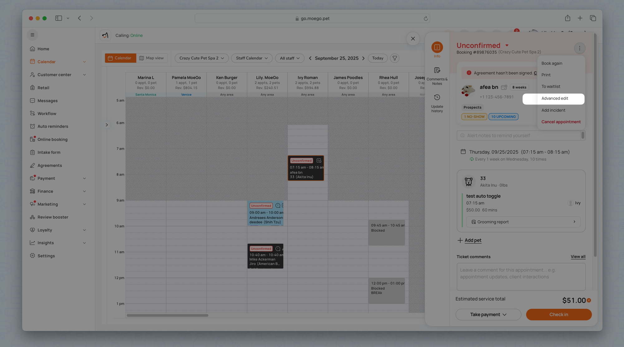 - Select the < three dots > at the top-right of the appointment detail and select < Advanced edit >