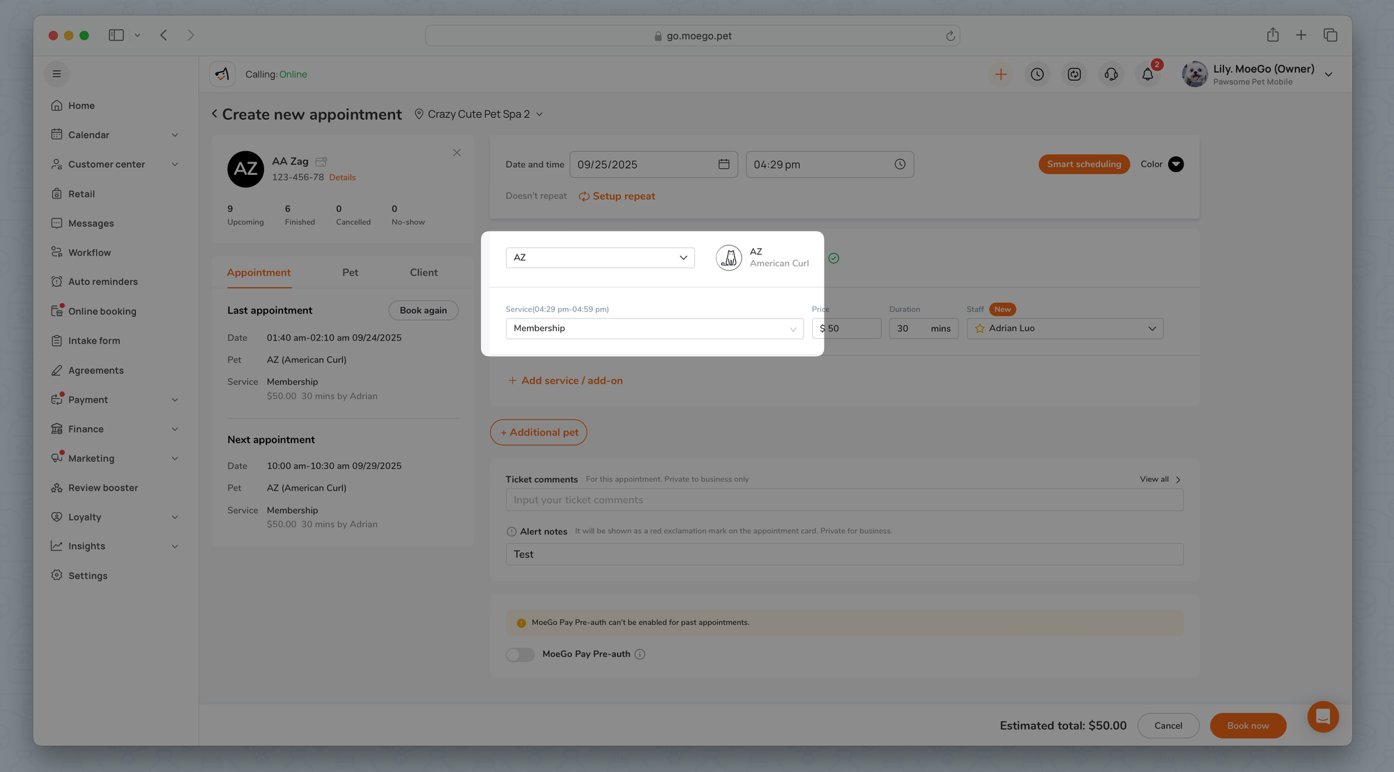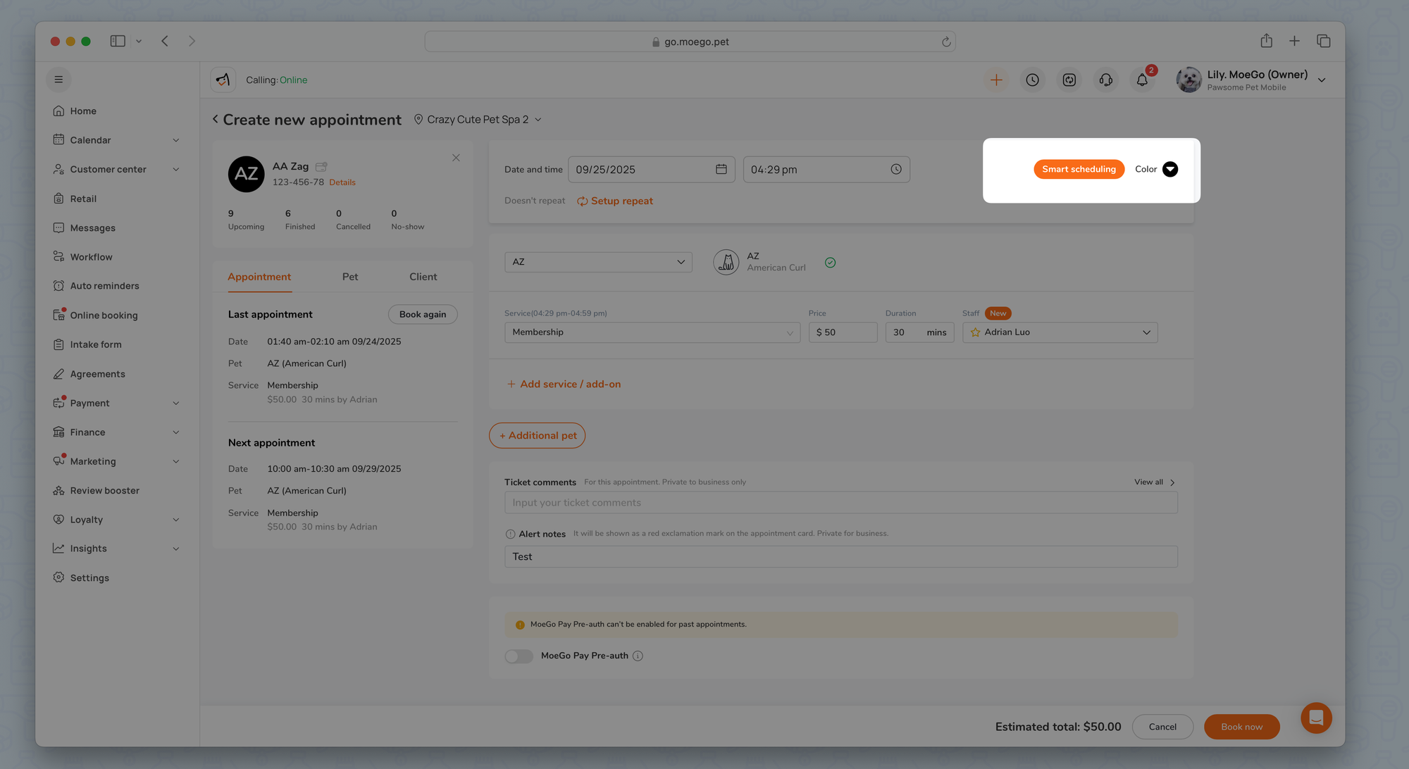 To use smart scheduling when booking a mobile grooming appointment for a new client on the app, you can: