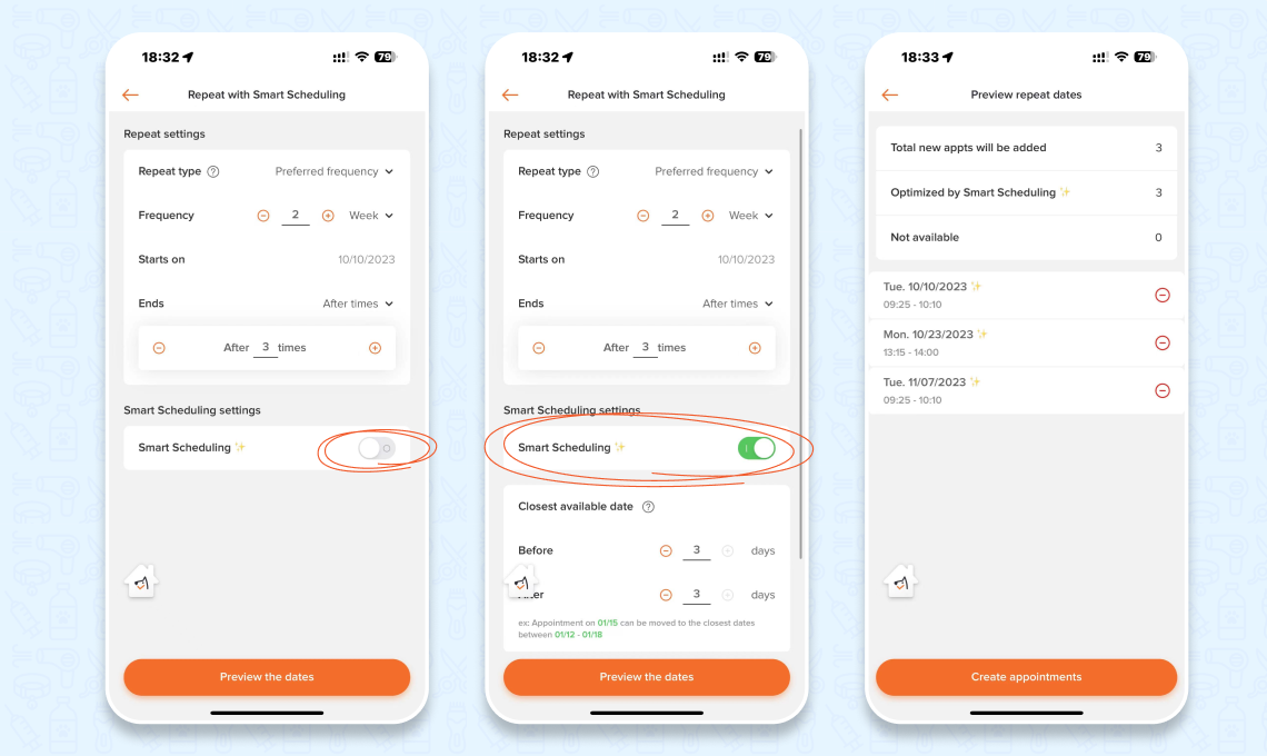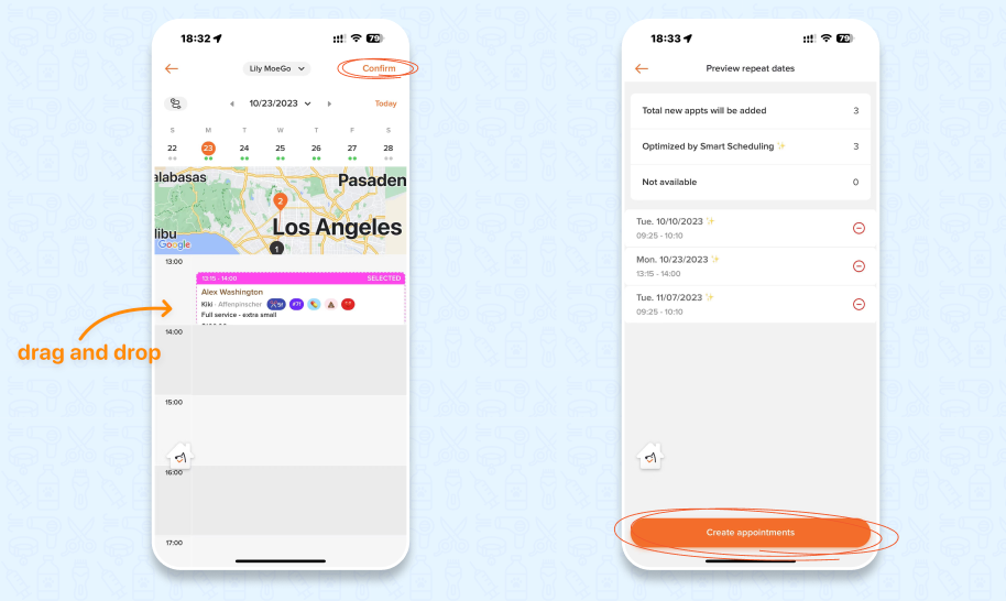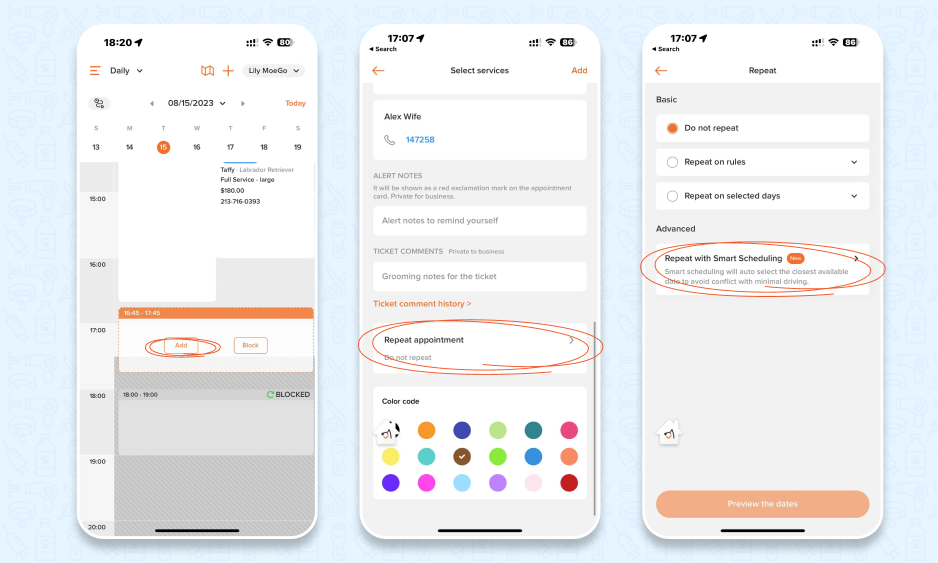 With the traditional repeat setting, it creates all future appointments on the same date and time. You have to manually fix the conflicts, and not even to mention, for mobile groomers, you have to reroute to ensure you are not driving all over the place. It’s extremely complicated, time-consuming, and stressful.
