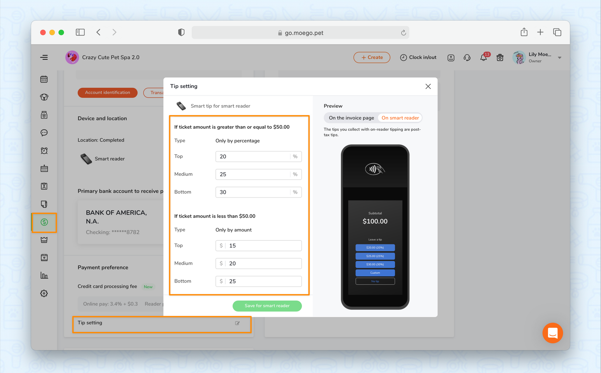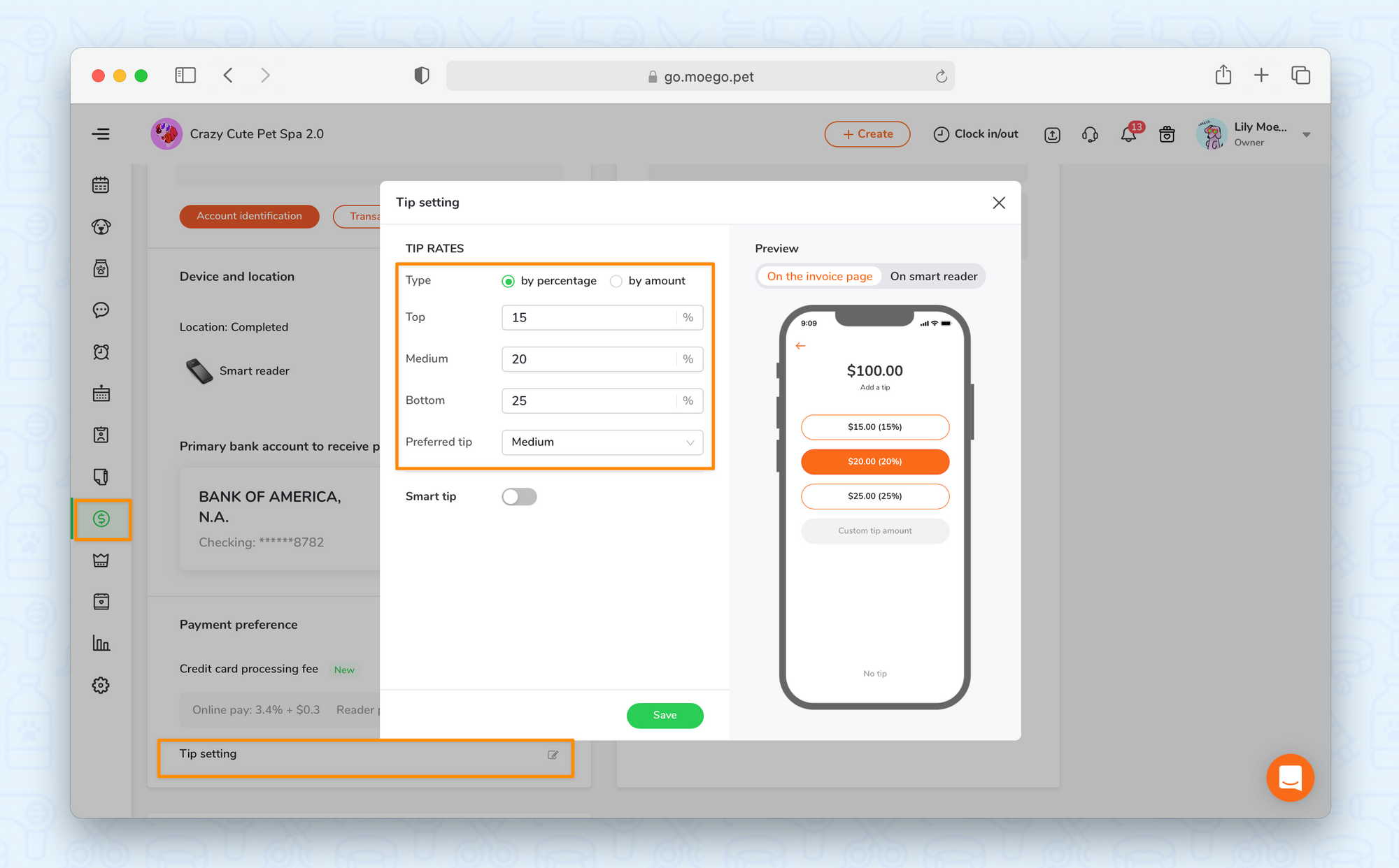 Answer: Smart Tip is a MoeGo Pay exclusive feature. Once you set up MoeGo Pay powered by Stripe, set MoeGo Pay as the primary card processor, and you're ready to go!
