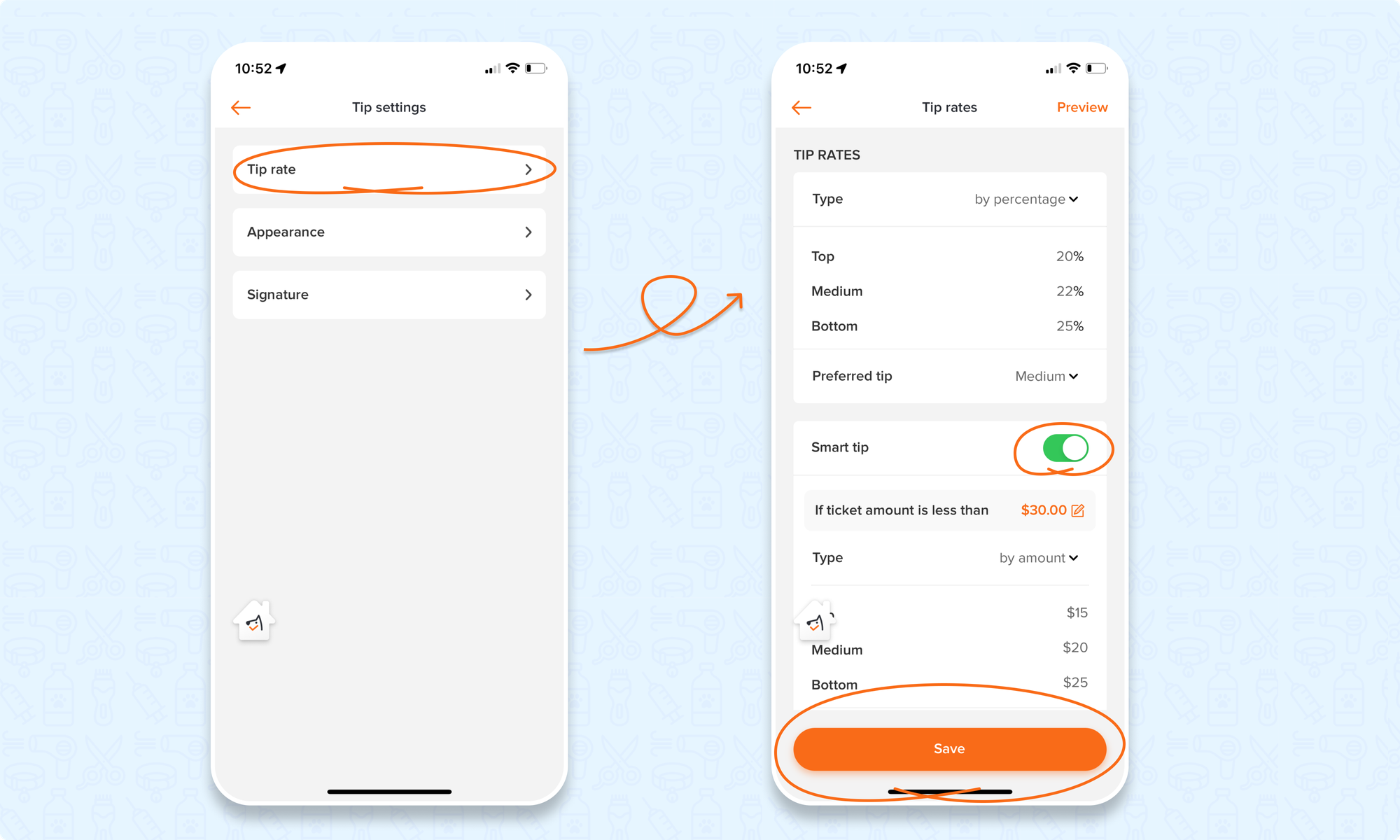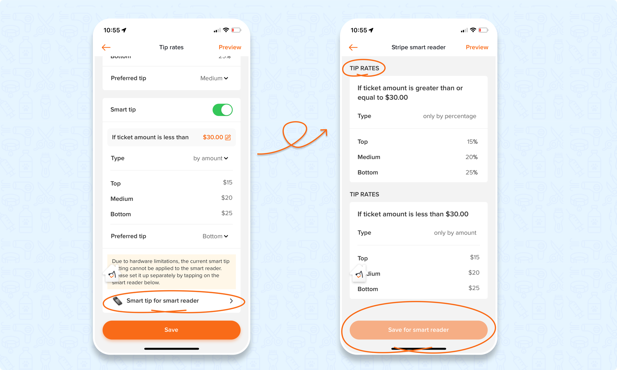 For users of the Stripe smart reader, simply navigate to the bottom of the tip rate settings and select < Smart tip for smart reader settings > to input the rates for the reader screen.