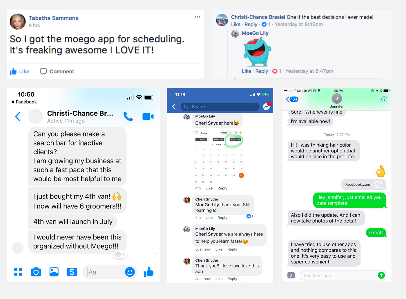 We built a social community on Facebook as a channel to connect with our customers and collect feedback. MoeGo Lily (https://www.facebook.com/MoeGoLily), our chief customer success officer, has become a bridge between the MoeGo team and groomers. In product discussion meetings, Lily always brings a lot to the table with customer insights. She loves our customers so much that we even feel she’s a groomer representative sitting in our meeting room. We love that because this makes us feel close to our customers!