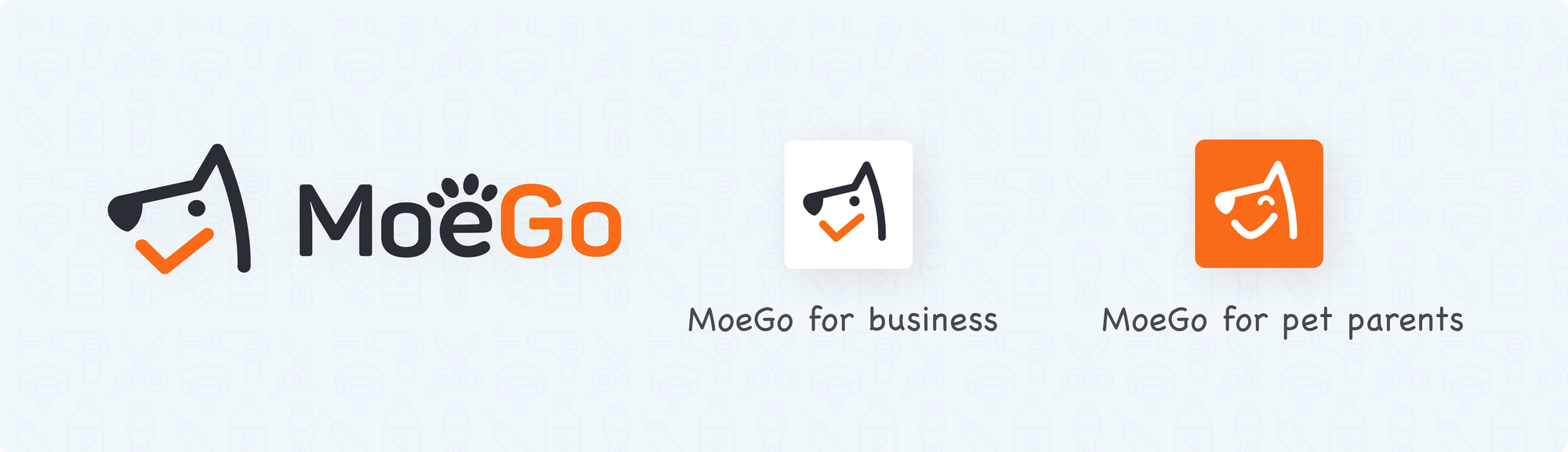 We hired the best Logo designer we could find. After weeks of the back-and-force discussions, we landed on the current logos (see below) as our business logo and consumer app logo. We really liked the idea of the orange check mark in the dog's face, creating a sense of productivity. While for the MoeGo pet owner app, the check mark changed to a mild curve line mimicking smiling. We hope that your clients will be even happier when you use MoeGo since you will become more productive, haha!